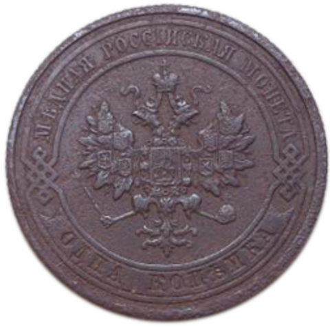 Аверс: вверху вдоль края монеты в выделенной выступающей рамкой полосе надпись «МЕДНАЯ РОССИЙСКАЯ МОНЕТА», внизу вдоль края монеты в выступающей рамке, соединённой с верхней рамкой расположенными слева и справа фигурными решетками, на выступающей плашке вдавленными буквами обозначение номинала монеты «ОДНА КОПЕЙКА», в середине Малый Государственный Герб Российской империи.