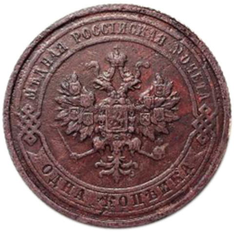 Аверс: вверху вдоль края монеты в выделенной выступающей рамкой полосе надпись «МЕДНАЯ РОССИЙСКАЯ МОНЕТА», внизу вдоль края монеты в выступающей рамке, соединённой с верхней рамкой расположенными слева и справа фигурными решетками, на выступающей плашке вдавленными буквами обозначение номинала монеты «ОДНА КОПЕЙКА», в середине Малый Государственный Герб Российской империи.