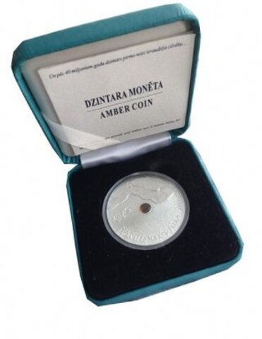 Монеты достоинством 1 лат содержат небольшой кусочек янтаря с латвийского побережья Балтийского моря, гармонично вписывающийся в общую композицию. С одной стороны монеты янтарь — это зрачок глаза, а со второй — камешек, лежащий на берегу моря. Янтарные монеты сделаны из серебра и изначально продавались по 40 евро.
