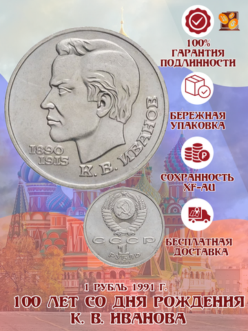 1 рубль 100 лет со дня рождения поэта К. В. Иванова 1991 г.