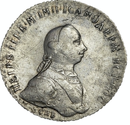 Аверс: в центре портрет Императора Петра III, обращенный вправо, под ним обозначение монетного двора «СПБ» (Санкт-Петербургский), вверху слева направо вдоль края надпись «ПЕТР.III. Б.М. ИМП.ИСАМОДЕРЖ ВСЕРОС» ( Петр III Божьей Милостью Император и Самодержец Всероссийский).