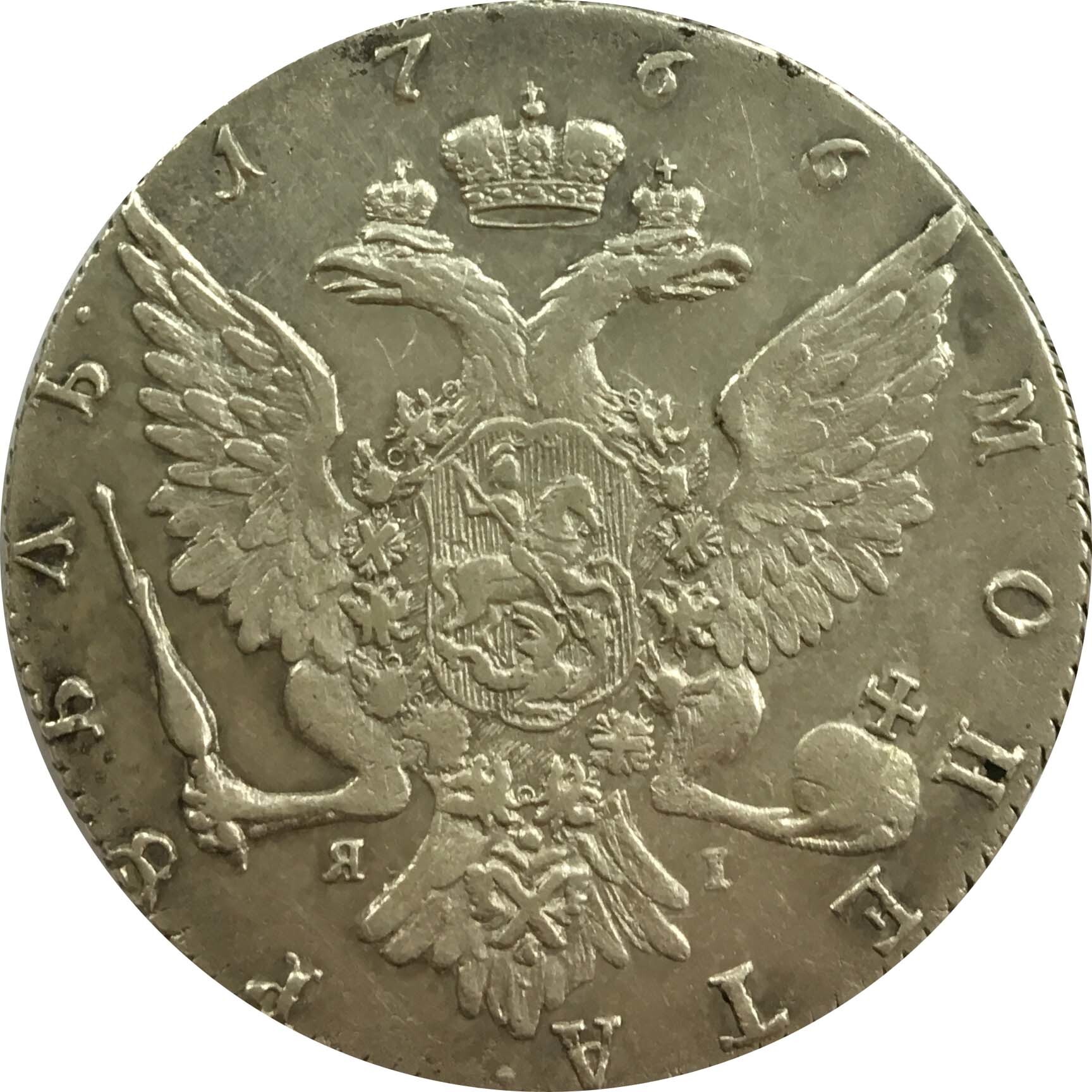 Реверс: в центре - Герб Российской Империи - двуглавый орёл со скипетром и державой, на груди орла – герб Москвы, над головами – год выпуска «1766». Слева по краю – надпись «РУБЛЬ.», справа – «МОНЕТА.», под лапами орла инициалы минцмейстера «ЯI» (Яков Иванов).