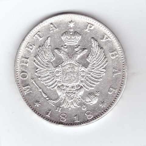 Аверс: В центре изображен Государственный Герб Российской империи - двуглавый орёл с поднятыми вверх распущенными крыльями. Головы которого увенчаны двумя коронами, третья, большая корона над ними. На груди орла расположен Московский герб - щит с изображением Георгия Победоносца, поражающего копьем дракона. Вокруг щита орденская цепь с орденом Св. Апостола Андрея Первозванного. В правой лапе орла – скипетр, в левой – держава. Под правой лапой – буква «П», под левой – буква «С». Инициалы минцмейстера Павла Ступицына. Слева от герба круговая надпись - «МОНЕТА», справа - «РУБЛЬ». Под инициалами — дата выпуска монеты «1818». Все три надписи разделены между собой тремя шестиконечными звёздами. По окружности канта имеются рельефные элементы, выполненные в виде зубцов.