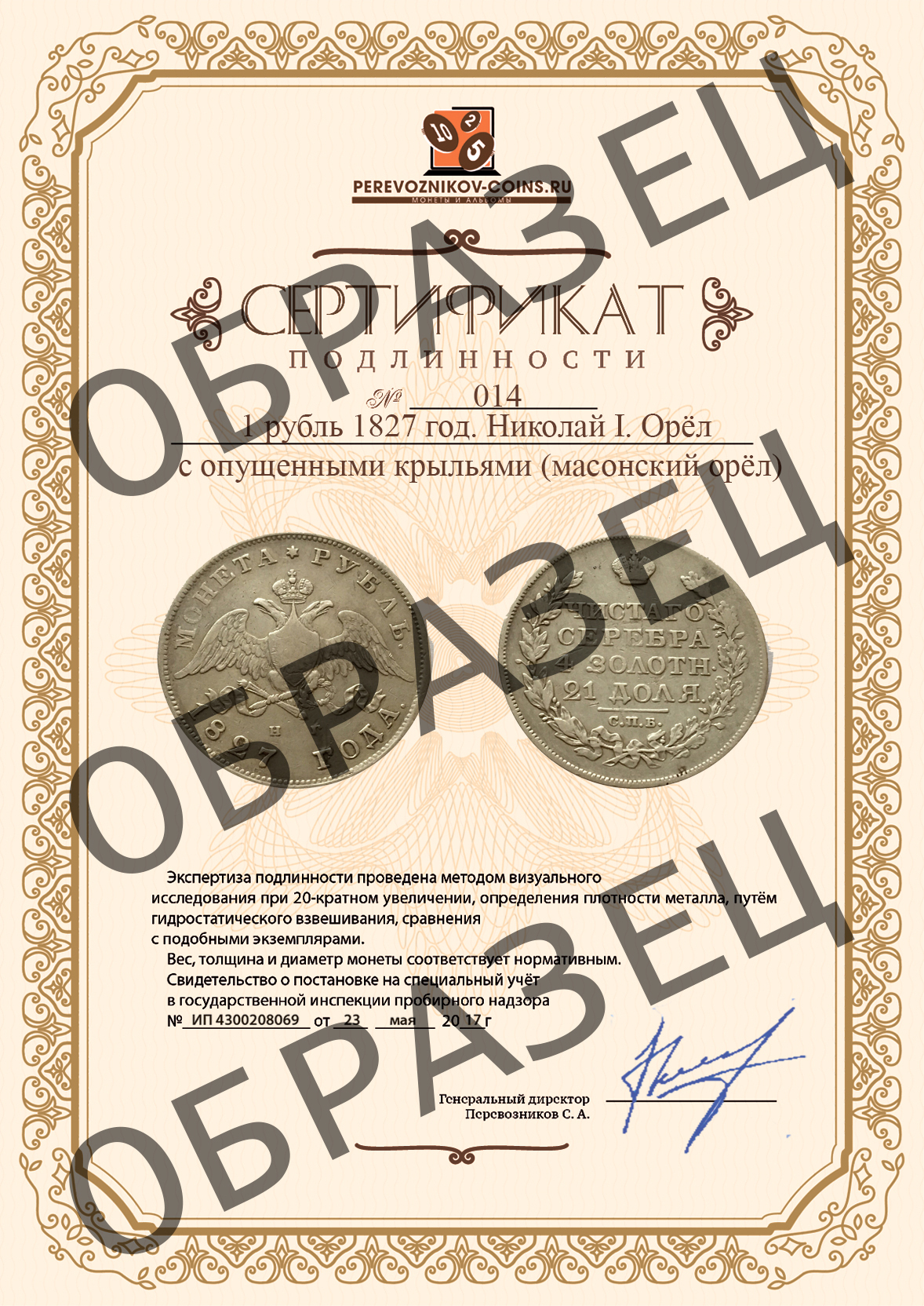 1 рубль 1827 год. Орел с опущенными крыльями (Масонский орел)