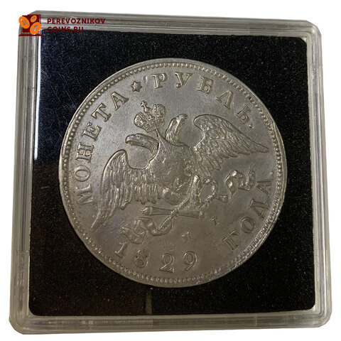 Аверс: В центре изображен Государственный Герб Российской империи - двуглавый орёл с распростёртыми и опущенными вниз крыльями. На груди орла расположен Московский герб - щит с изображением Георгия Победоносца, поражающего копьем дракона. Гербовый щит, над головами орла, венчает императорская корона. Орёл держит, перевитые орденской лентой ордена Св. Апостола Андрея Первозванного, громовые стрелы и факел в правой лапе и лавровый венок — в левой. Под лентой буквы: слева «Н», справа «Г». Инициалы минцмейстера Николая Грачева. Над орлом обозначение номинала - круговая надпись «МОНЕТА РУБЛЬ.» разделённая шестиконечной звездой. Под орлом — дата выпуска монеты «1829 ГОДА.». По окружности канта имеются рельефные элементы, выполненные в виде зубцов.