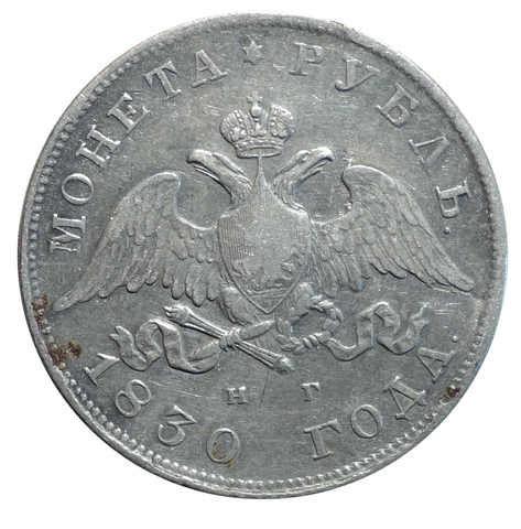 Аверс: В центре изображен Государственный Герб Российской империи - двуглавый орёл с распростёртыми и опущенными вниз крыльями. На груди орла расположен Московский герб - щит с изображением Георгия Победоносца, поражающего копьем дракона. Гербовый щит, над головами орла, венчает императорская корона. Орёл держит, перевитые орденской лентой ордена Св. Апостола Андрея Первозванного, громовые стрелы и факел в правой лапе и лавровый венок — в левой. Под лентой буквы: слева «Н», справа «Г». Инициалы минцмейстера Николая Грачева. Над орлом обозначение номинала - круговая надпись «МОНЕТА РУБЛЬ.» разделённая шестиконечной звездой. Под орлом — дата выпуска монеты «1830 ГОДА.». По окружности канта имеются рельефные элементы, выполненные в виде зубцов.