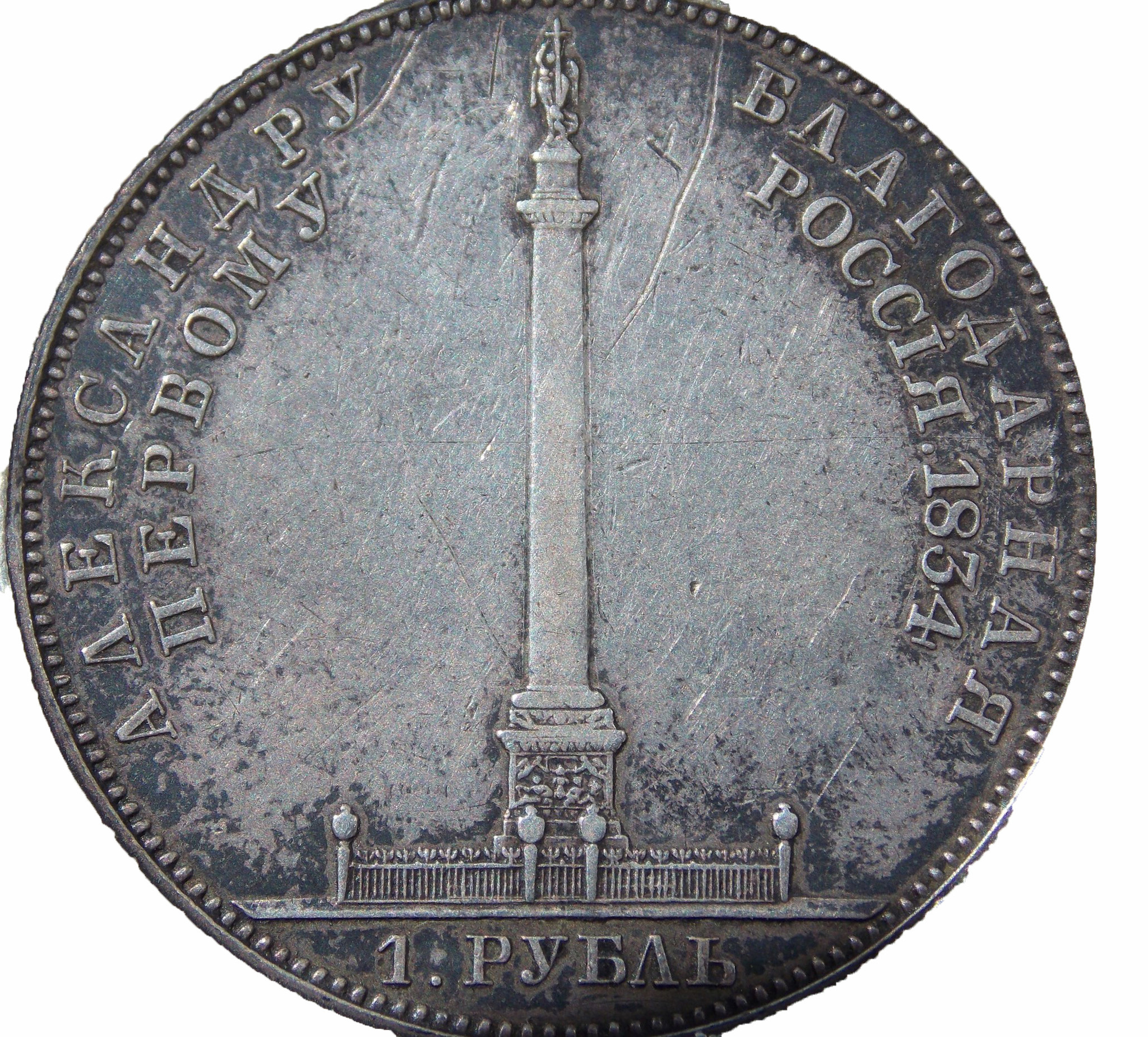 В ряду памятных монет, посвященных различным событиям отечественной истории, заметное место занимает серебряный рубль, выпущенный по случаю торжественного открытия Александровской колонны в Санкт-Петербурге. На лицевой стороне монеты отчеканен профиль Александра I; изображение колонны, призванной символизировать победу над Наполеоном и величие императора России, украшает оборотную сторону. Там же находится надпись «Александру Первому благодарная Россия» и дата открытия монумента - 1834 год (сама монета отчеканена двумя годами позже, в 1836 году).