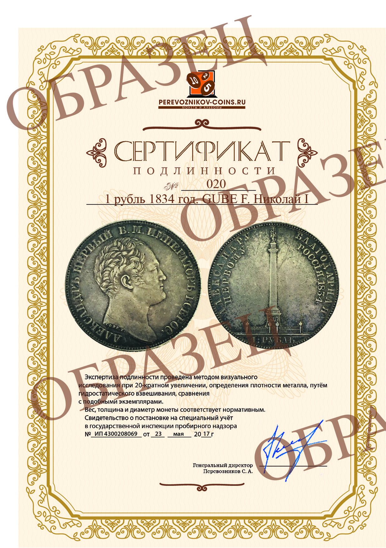 1 рубль 1834 год. GUBE F. Николай I. В память открытия Александровской колонны