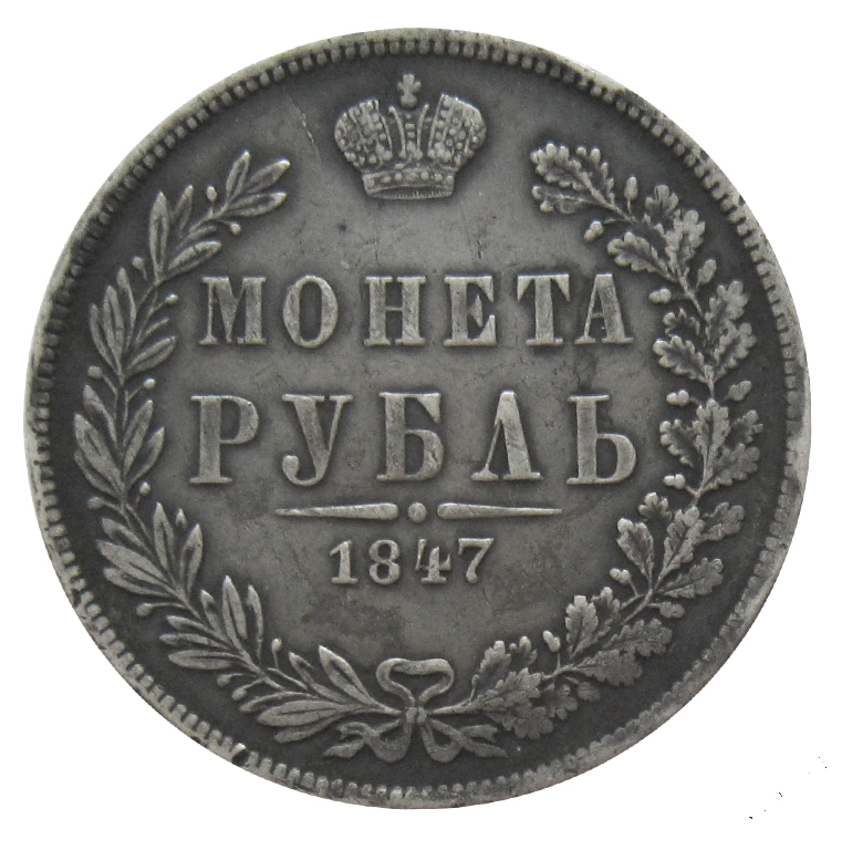 Реверс: вдоль края монеты зубчатый ободок, в середине вверху императорская корона, под ней надпись «МОНЕТА», ниже слово «РУБЛЬ». Слева вдоль края лавровая ветвь, справа дубовая, внизу ветви соединяются и перевязаны лентой, над ней год выпуска «1847», над ним две направленные в разные стороны черты, между которыми точка.