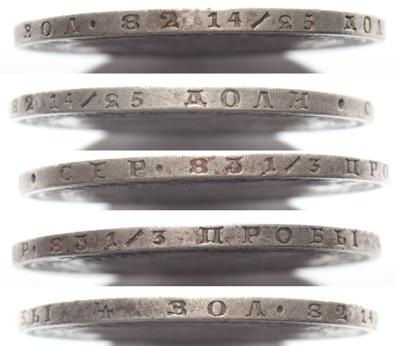 Аверс: по кругу вдоль края монеты разделенная вверху розеткой надпись «ЧИСТОГО СЕРЕБРА 4 ЗОЛОТНИКА 21 ДОЛЯ», в середине в круге из точек герб Российской империи, внизу слева и справа от хвоста орла инициалы минцмейстера «HI» (Николай Иосса).