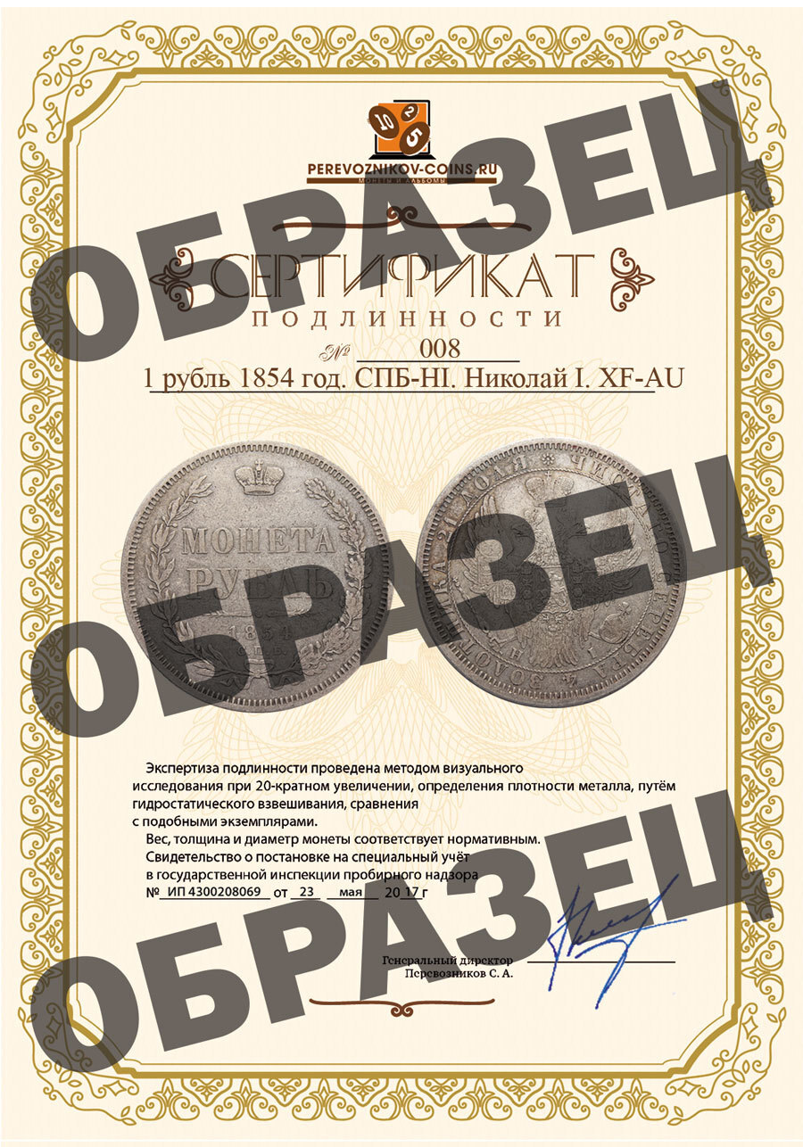 К данной монете прилагается сертификат подлиннности от компании perevoznikov-coins.
