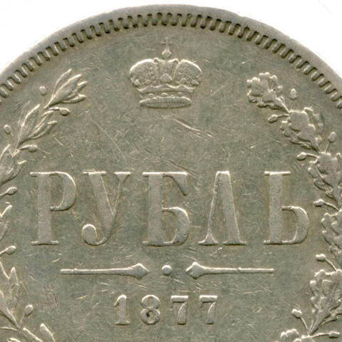 Реверс: В центре указан номинал «РУБЛЬ». Над номиналом – Корона Российской империи. Под номиналом расположен декоративный разделитель в виде двух разнонаправленных фигурных линий и небольшой выпуклой точки между ними. Под разделителем — дата выпуска монеты «1877». Под цифрой даты — обозначение монетного двора «С.П.Б.». Вдоль канта, не доходя до короны, изображен венок из лавровой и дубовой ветви, которые в нижней части перевязаны лентой на узел бантом. По окружности канта имеются рельефные элементы, выполненные в виде зубцов.