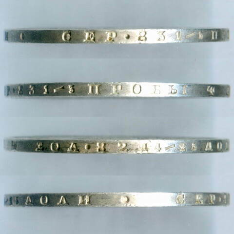Аверс: В центре изображен Малый Государственный Герб Российской империи - двуглавый орёл, головы которого увенчаны двумя коронами, третья, большая корона над ними. Все они соединены орденской лентой ордена Св. Апостола Андрея Первозванного. На груди орла расположен Московский герб, в щите изображен Георгий Победоносец с копьем поражающий дракона. Вокруг щита цепь ордена Св. Апостола Андрея Первозванного. На крыльях изображены гербы: Царства Казанского, Польского, Херсонеса Таврического, Астраханского, Сибирского, Грузинского и герб соединенных княжеств Киевского, Новгородского и Владимирского — по 4 на каждое крыло. В правой лапе орла – скипетр, в левой – держава. Под правой лапой – буква «Н», под левой – буква «I». Инициалы минцмейстера Николая Иоссы. Центральная часть отделена от остального изображения, окружностью в виде точек. За окружностью круговая надпись: «ЧИСТОГО СЕРЕБРА 4 ЗОЛОТНИКА 21 ДОЛЯ», разделенная сверху цветочной розеткой. По окружности канта имеются рельефные элементы, выполненные в виде зубцов.