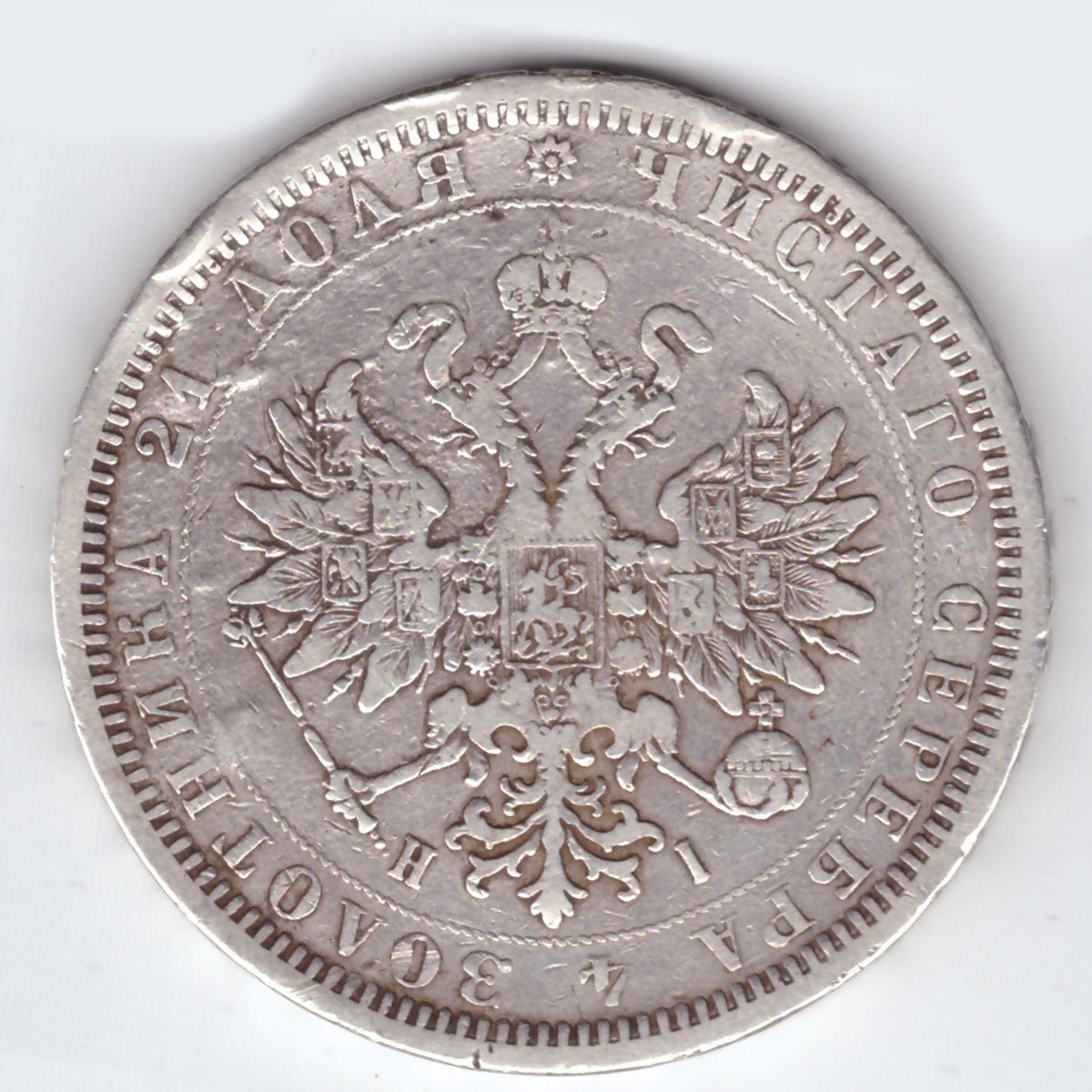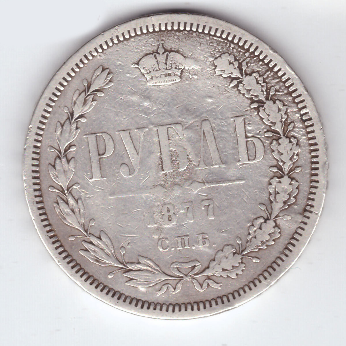 Реверс: В центре указан номинал «РУБЛЬ». Над номиналом – Корона Российской империи. Под номиналом расположен декоративный разделитель в виде двух разнонаправленных фигурных линий и небольшой выпуклой точки между ними. Под разделителем — дата выпуска монеты «1877». Под цифрой даты — обозначение монетного двора «С.П.Б.». Вдоль канта, не доходя до короны, изображен венок из лавровой и дубовой ветви, которые в нижней части перевязаны лентой на узел бантом. По окружности канта имеются рельефные элементы, выполненные в виде зубцов.