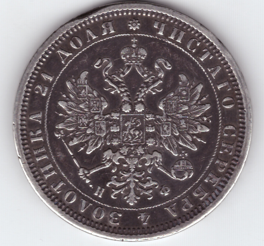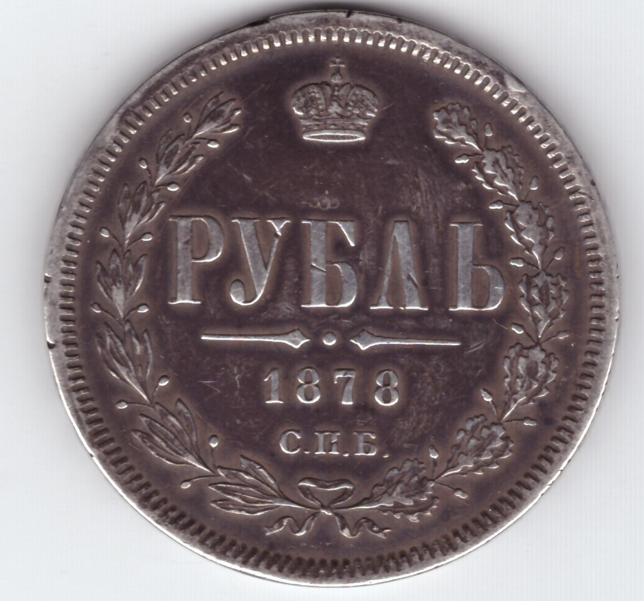 Реверс: В центре указан номинал «РУБЛЬ». Над номиналом – Корона Российской империи. Под номиналом расположен декоративный разделитель в виде двух разнонаправленных фигурных линий и небольшой выпуклой точки между ними. Под разделителем — дата выпуска монеты «1878». Под цифрой даты — обозначение монетного двора «С.П.Б.». Вдоль канта, не доходя до короны, изображен венок из лавровой и дубовой ветви, которые в нижней части перевязаны лентой на узел бантом. По окружности канта имеются рельефные элементы, выполненные в виде зубцов.