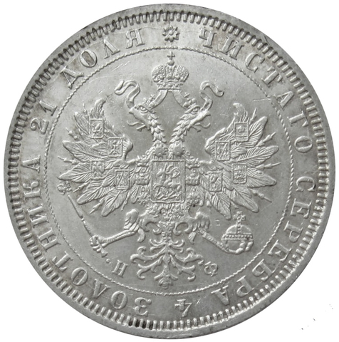 Аверс: В центре изображен Малый Государственный Герб Российской империи - двуглавый орёл, головы которого увенчаны двумя коронами, третья, большая корона над ними. Все они соединены орденской лентой ордена Св. Апостола Андрея Первозванного. На груди орла расположен Московский герб, в щите изображен Георгий Победоносец с копьем поражающий дракона. Вокруг щита цепь ордена Св. Апостола Андрея Первозванного. На крыльях изображены гербы: Царства Казанского, Польского, Херсонеса Таврического, Астраханского, Сибирского, Грузинского и герб соединенных княжеств Киевского, Новгородского и Владимирского — по 4 на каждое крыло. В правой лапе орла – скипетр, в левой – держава. Под правой лапой – буква «Н», под левой – буква «Ф». Инициалы минцмейстера Николая Фоллендорфа. Центральная часть отделена от остального изображения, окружностью в виде точек. За окружностью круговая надпись: «ЧИСТОГО СЕРЕБРА 4 ЗОЛОТНИКА 21 ДОЛЯ», разделенная сверху цветочной розеткой. По окружности канта имеются рельефные элементы, выполненные в виде зубцов.