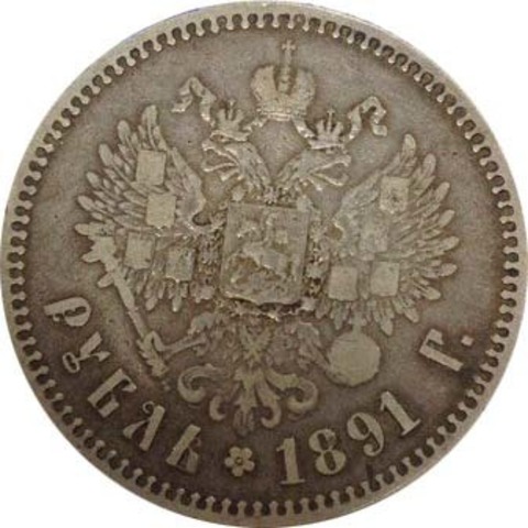 Аверс: в середине Малый Государственный Герб Российской империи, под ним вдоль края монеты, разделенные розеткой, номинал «РУБЛЬ» и год выпуска монеты «1891 Г.».