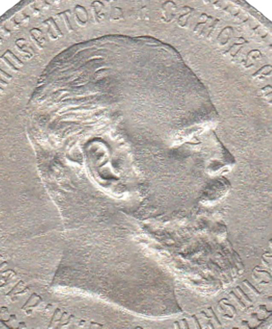 Реверс: по кругу вдоль края монеты, разделенная внизу цветочной розеткой, надпись «Б.М. АЛЕКСАНДР III ИМПЕРАТОР И САМОДЕРЖЕЦ ВСЕРОССИЙСКИЙ», в середине обращенная вправо голова Императора Российской империи Александра III.
