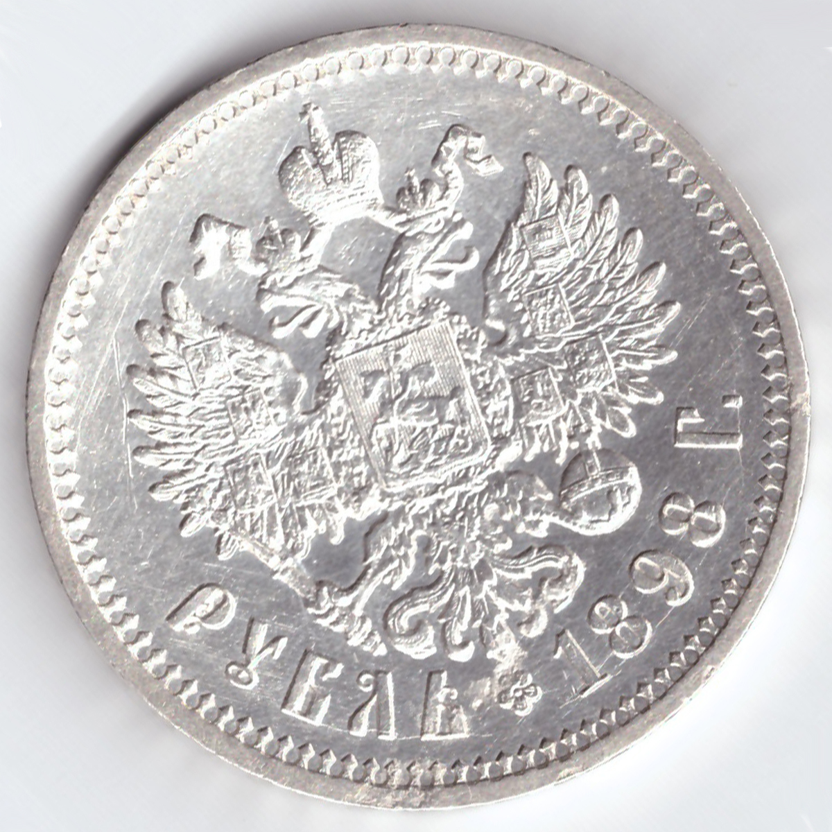 Реверс: В центре изображен Малый Государственный Герб Российской империи - двуглавый орёл, головы которого увенчаны двумя коронами, третья, большая корона над ними. Все они соединены орденской лентой ордена Св. Апостола Андрея Первозванного. На груди орла расположен Московский герб, в щите изображен Георгий Победоносец с копьем поражающий дракона. Вокруг щита цепь ордена Св. Апостола Андрея Первозванного. На крыльях изображены гербы: Царства Казанского, Польского, Херсонеса Таврического, Астраханского, Сибирского, Грузинского и герб соединенных княжеств Киевского, Новгородского и Владимирского — по 4 на каждое крыло. В правой лапе орла – скипетр, в левой – держава. Под ним слева направо изображены: номинал - надпись «РУБЛЬ», цветочная розетка и дата выпуска «1898 Г.». По окружности канта имеются рельефные элементы, выполненные в виде зубцов.