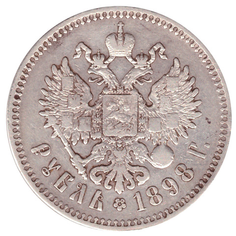 Реверс: В центре изображен Малый Государственный Герб Российской империи - двуглавый орёл, головы которого увенчаны двумя коронами, третья, большая корона над ними. Все они соединены орденской лентой ордена Св. Апостола Андрея Первозванного. На груди орла расположен Московский герб - щит с изображением Георгия Победоносца с копьём, поражающего дракона. Вокруг щита цепь ордена Св. Апостола Андрея Первозванного. На крыльях изображены гербы: Царства Казанского, Польского, Херсонеса Таврического, Астраханского, Сибирского, Грузинского и герб соединенных княжеств Киевского, Новгородского и Владимирского — по 4 на каждое крыло. В правой лапе орла – скипетр, в левой – держава. Под ним слева направо изображены: номинал - надпись «РУБЛЬ», цветочная розетка и дата выпуска «1898 Г.». По окружности канта имеются рельефные элементы, выполненные в виде зубцов.