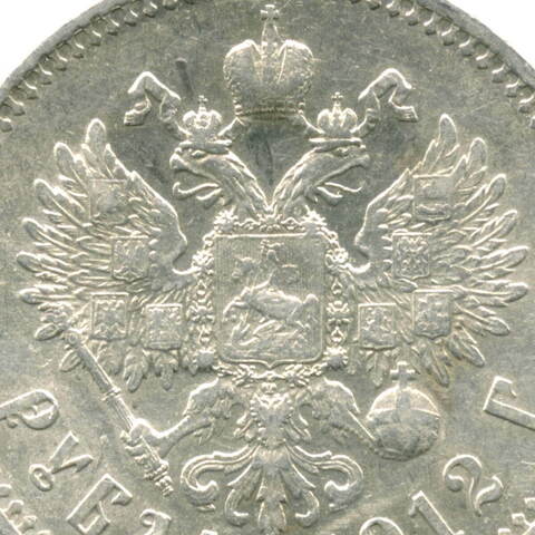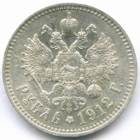 Реверс: В центре изображен Малый Государственный Герб Российской империи - двуглавый орёл, головы которого увенчаны двумя коронами, третья, большая корона над ними. Все они соединены орденской лентой ордена Св. Апостола Андрея Первозванного. На груди орла расположен Московский герб, в щите изображен Георгий Победоносец с копьем поражающий дракона. Вокруг щита цепь ордена Св. Апостола Андрея Первозванного. На крыльях изображены гербы: Царства Казанского, Польского, Херсонеса Таврического, Астраханского, Сибирского, Грузинского и герб соединенных княжеств Киевского, Новгородского и Владимирского — по 4 на каждое крыло. В правой лапе орла – скипетр, в левой – держава. Под ним слева направо изображены: номинал - надпись «РУБЛЬ», цветочная розетка и дата выпуска «1912 Г.». По окружности канта имеются рельефные элементы, выполненные в виде зубцов.