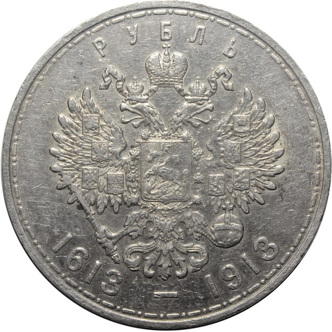 На реверсе изображен двуглавый царский орел со скипетром и державой. Над орлом надпись с обозначением номинала «РУБЛЬ», внизу даты: «1613—1913». По периметру узор «черта с точкой».