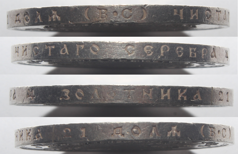 Гурт гладкий, с выдавленной надписью «ЧИСТОГО СЕРЕБРА 4 ЗОЛОТНИКА 21 ДОЛЯ» и знаком минцмейстера Санкт-Петербургского монетного двора Виктора Смирнова «(В•С)».