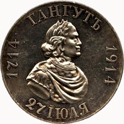 Реверс: вверху вдоль края монеты надпись «ГАНГУТ», слева год сражения «1714», справа год выпуска монеты «1914», внизу дата сражения «27 ИЮЛЯ», в середине повернутый вправо бюст императора Российской империи Петра I.