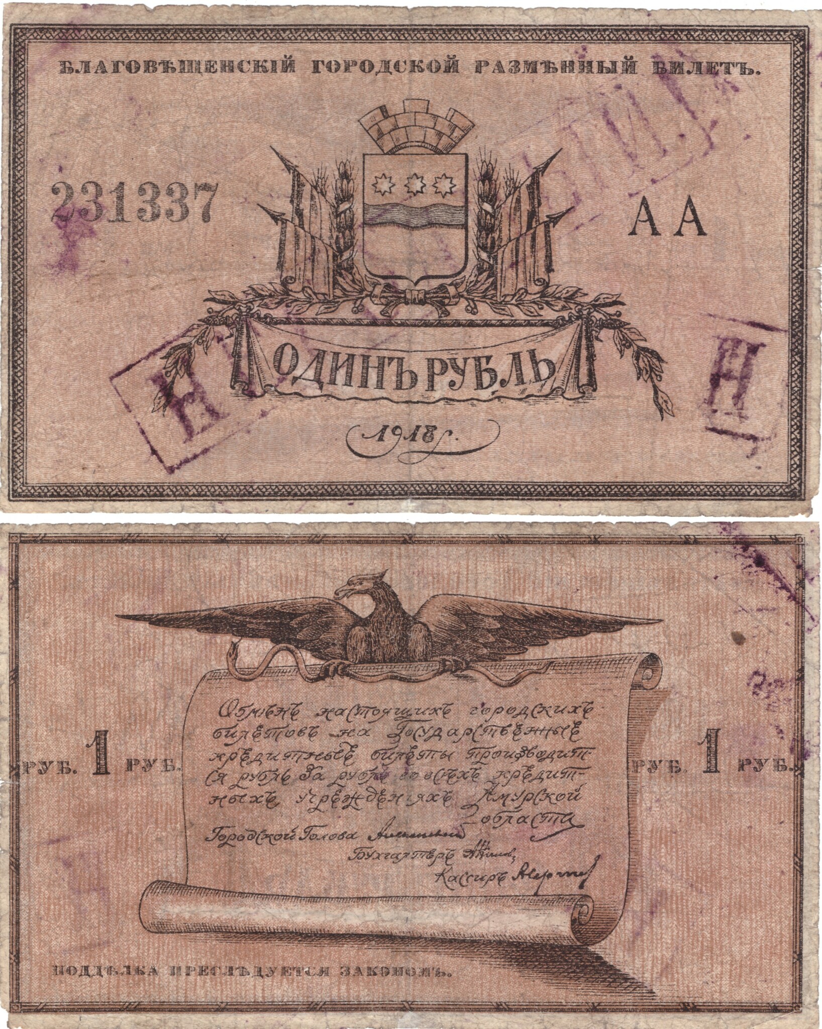 1 рубль 1918. Благовещенск. Амурская область. Городской разменный билет.