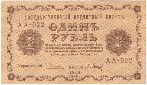 1 рубль 1918 г. Барышев. АА-022 (есть надрывы)