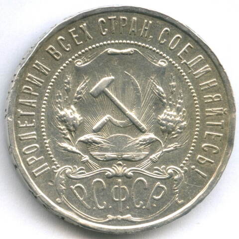 Реверс: В центре пятиконечной звезды расположена единица номинала, расчерченная мелкими горизонтальными линиями. Между нижними лучами звезды находится дата чеканки "1921". По краям монетного поля венок, собранный из ветвей дуба и лавра, перевязанных бантом. В разрыве венка обозначение денежной единицы "РУБЛЬ". Звезду и венок разделяет ободок, набранный из точек. Известны подгравировки.