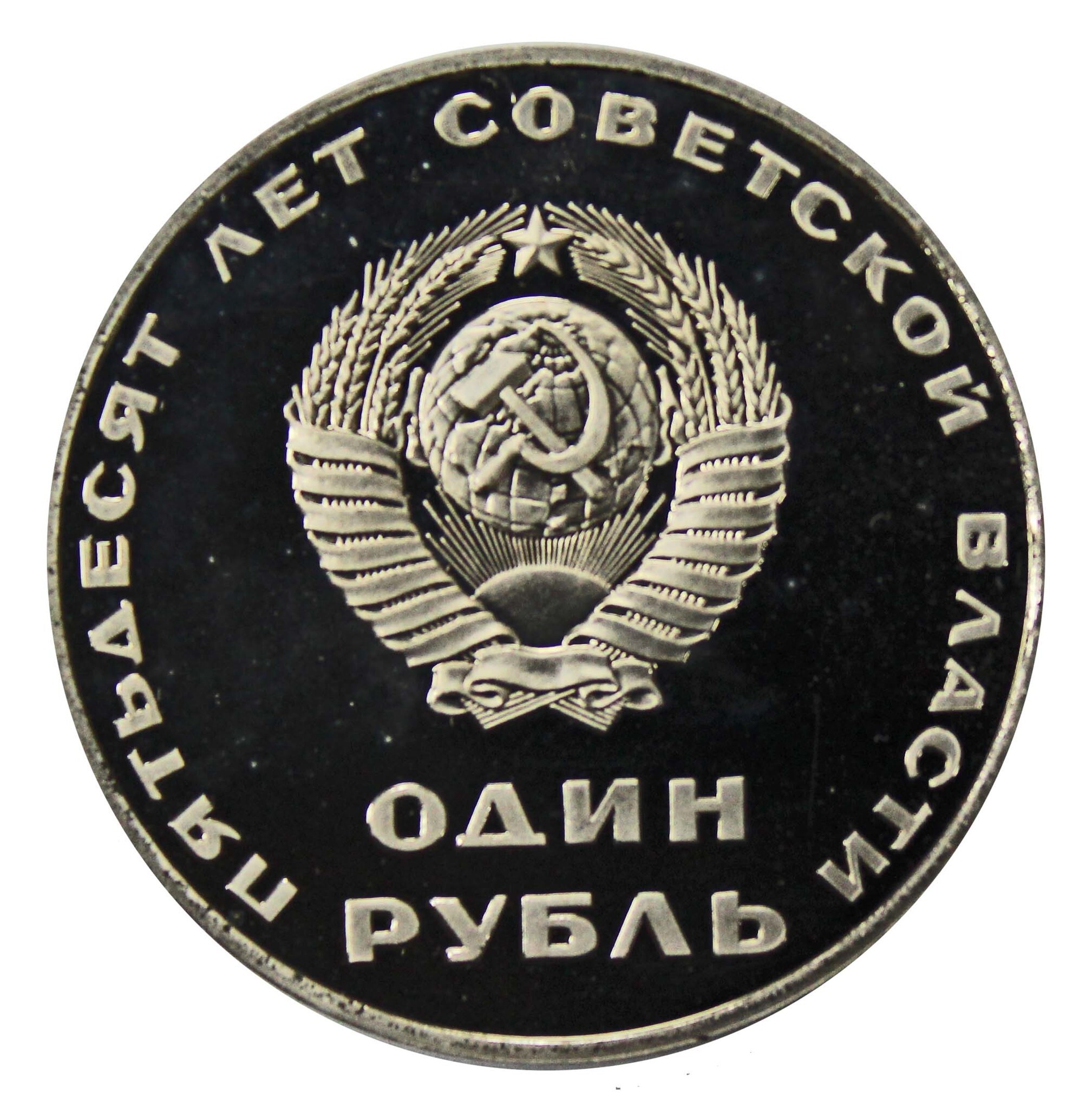 Аверс: сверху вдоль края монеты слова «ПЯТЬДЕСЯТ ЛЕТ СОВЕТСКОЙ ВЛАСТИ», в центре герб СССР с 15 витками ленты, под ним обозначение достоинства монеты «ОДИН» и ниже слово «РУБЛЬ».