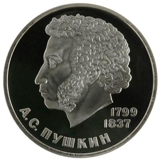 Реверс: в центре изображение А. С. Пушкина и справа от него в две строки даты «1799» и «1837», в нижней части полукругом надпись «А. С. ПУШКИН».