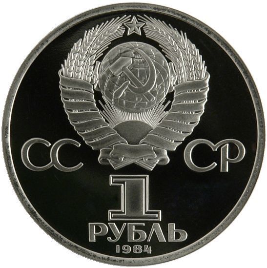Аверс: сверху герб СССР с 15 витками ленты, слева от него буквы «СС», справа «СР», ниже обозначение достоинства монеты цифра «1» и ниже слово «РУБЛЬ», внизу у канта год выпуска монеты «1984».