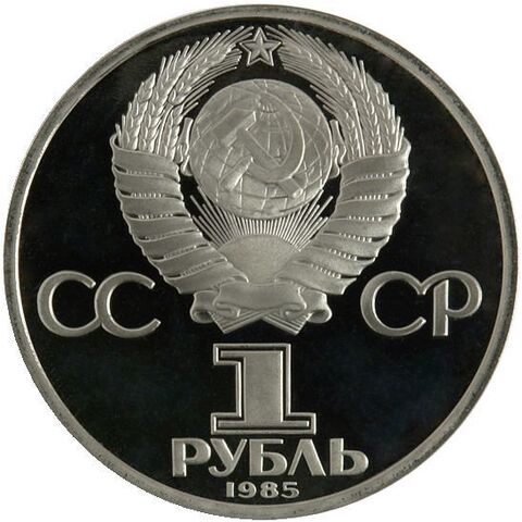 Аверс: сверху герб СССР с 15 витками ленты, слева от него буквы «СС», справа «СР», ниже обозначение достоинства монеты цифра «1» и ниже слово «РУБЛЬ», внизу у канта год выпуска монеты «1985».