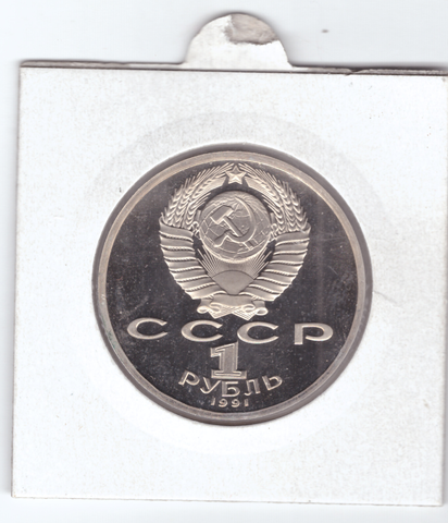 Аверс: Сверху герб СССР с 15 витками ленты, под ним буквы «СССР», ниже обозначение достоинства монеты цифра «1» и ниже слово «РУБЛЬ», внизу у канта год выпуска монеты «1991».