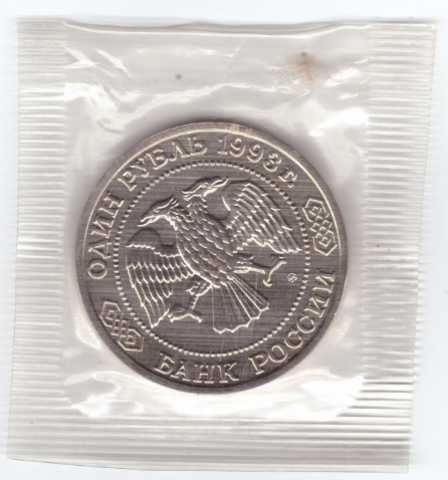 Аверс: Вверху вдоль канта номинал «ОДИН РУБЛЬ» и год выпуска «1993 г.», внизу слова «БАНК РОССИИ». В середине двуглавый орел под ним справа монограмма монетного двора «ММД».