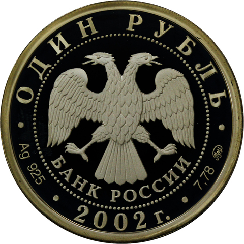 Аверс: Вверху вдоль канта номинал «ОДИН РУБЛЬ», внизу слева химическое название «Ag» и проба «925» металла, внизу по центру год выпуска «2002 г.», внизу справа чистый вес находящегося в монете драгоценного металла «7,78» и монограмма монетного двора «ММД». В середине в ободке из точек двуглавый орел под ним с внутренней стороны точечного ободка слова «БАНК РОССИИ».