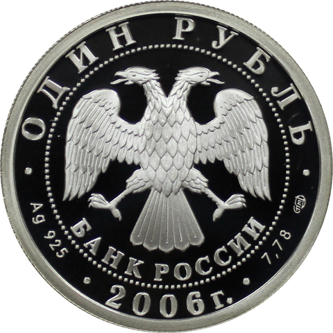 Аверс: Вверху вдоль канта номинал «ОДИН РУБЛЬ», внизу слева химическое название «Ag» и проба «925» металла, внизу по центру год выпуска «2006 г.», внизу справа чистый вес находящегося в монете драгоценного металла «7,78» и монограмма монетного двора «СПМД». В середине в ободке из точек двуглавый орел под ним с внутренней стороны точечного ободка слова «БАНК РОССИИ».