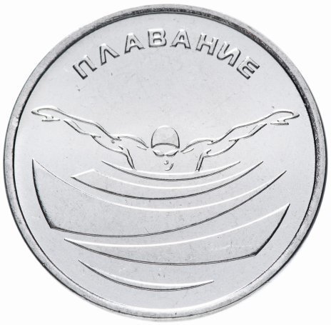 Реверс монеты: в центре – изображение пловца, вверху – надпись «ПЛАВАНИЕ».
