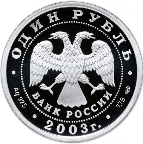 Аверс: вверху вдоль канта номинал «ОДИН РУБЛЬ», внизу слева химическое название «Ag» и проба «925» металла, внизу по центру год выпуска «2003 г.», внизу справа чистый вес находящегося в монете драгоценного металла «7,78» и монограмма монетного двора «СПМД». В середине в ободке из точек двуглавый орел под ним с внутренней стороны точечного ободка слова «БАНК РОССИИ».