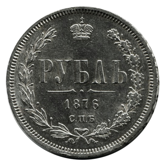 Реверс: вверху монеты корона Российской империи, ниже обозначение номинала «РУБЛЬ», по ним две направленные в разные стороны фигурные черты, ниже год выпуска монеты «1876» и под ним обозначение монетного двора «СПБ». Слева вдоль края монеты лавровая ветвь, справа дубовая, внизу ветви соединяются и перевязаны лентой.