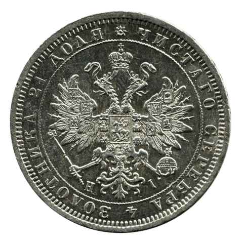 Аверс: по кругу вдоль края монеты разделенная вверху розеткой надпись «ЧИСТОГО СЕРЕБРА 4 ЗОЛОТНИКА 21 ДОЛЯ», в середине в круге из точек Малый Государственный Герб Российской империи, внизу слева и справа от хвоста орла инициалы минцмейстера «НІ» (Николай Иосса).