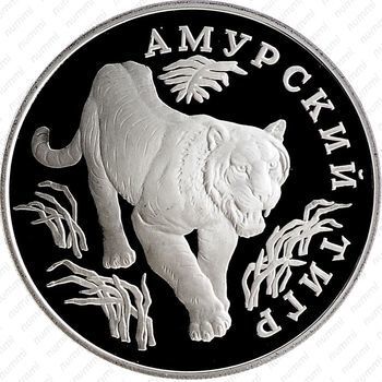 Реверс: изображение амурского тигра на фоне растительности, справа от изображения - надпись по окружности: "АМУРСКИЙ ТИГР".