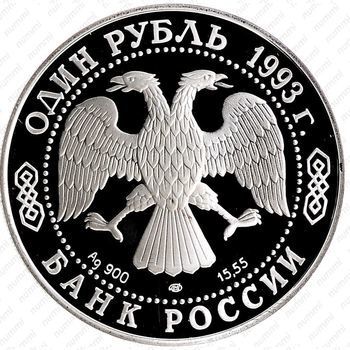 Аверс: вверху вдоль канта номинал «1 рубль» и год выпуска «1993 г.», внизу слова «БАНК РОССИИ». В середине в ободке из точек двуглавый орел под ним с внутренней стороны точечного ободка слева химическое название «Ag» и проба «900» металла, далее направо монограмма монетного двора «ЛМД» и чистый вес находящегося в монете драгоценного металла «15,55».