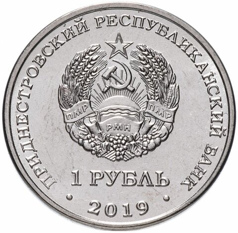 Аверс монеты: в центре – изображение Государственного герба Приднестровской Молдавской Республики; по кругу – надписи: вверху – «ПРИДНЕСТРОВСКИЙ РЕСПУБЛИКАНСКИЙ БАНК», внизу – год выпуска монеты «2019»; в нижней части под гербом – номинал «1 РУБЛЬ».