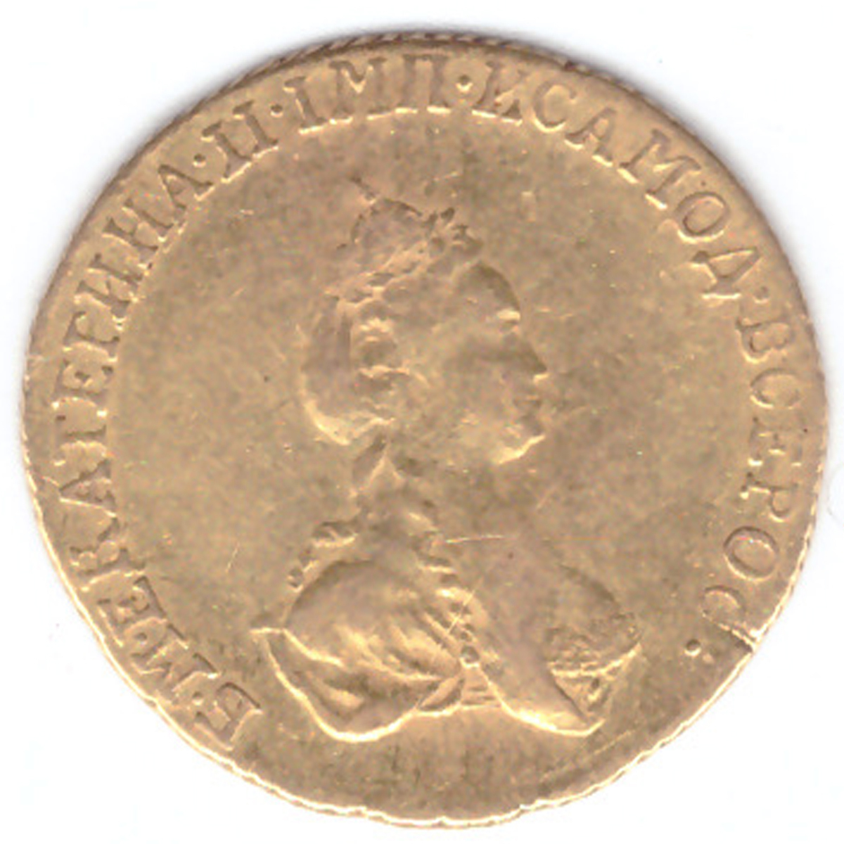 Аверс: В центре профильный портрет вправо императрицы Екатерины II. Вокруг портрета круговая надпись: «Б•М•ЕКАТЕРИНА•II•IМП•IСАМОД•ВСЕРОС•». По окружности канта имеются рельефные элементы, выполненные в виде зубцов.
