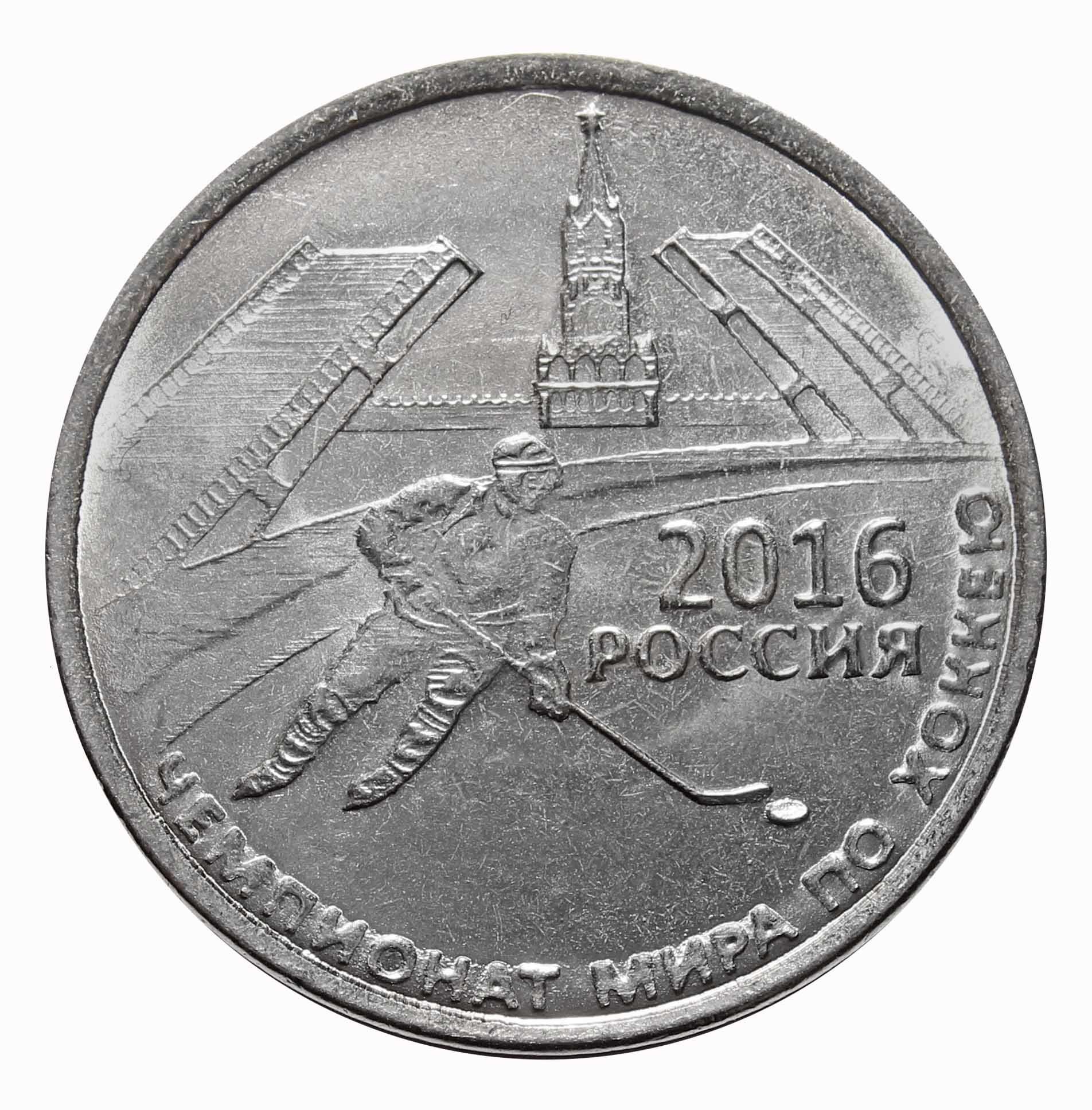 Реверс монеты : в центре – изображение хоккеиста на фоне Спасской башни Московского Кремля и разведенного моста в Санкт-Петербурге; внизу – по кругу надпись «Чемпионат мира по хоккею», в центре – надпись «2016 Россия».