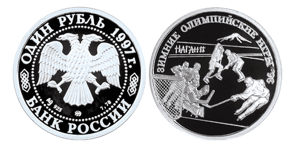 1 рубль Хоккей Зимняя Олимпиада в Нагано 1998 г. 1997 г. Proof