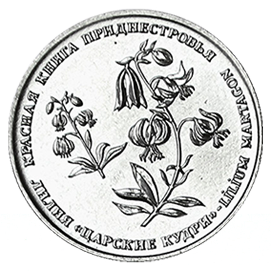 Реверс: в центре находится стилизованное изображение лилии. Вдоль края реверса находятся надписи: «КРАСНАЯ КНИГА ПРИДНЕСТРОВЬЯ», «ЛИЛИЯ «ЦАРСКИЕ КУДРИ» – LILIUM MARTAGON.
